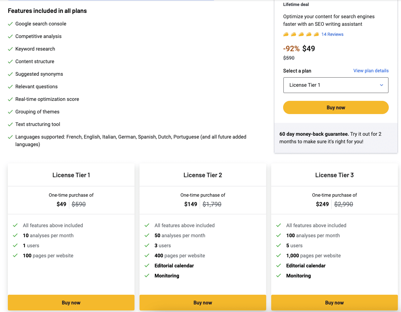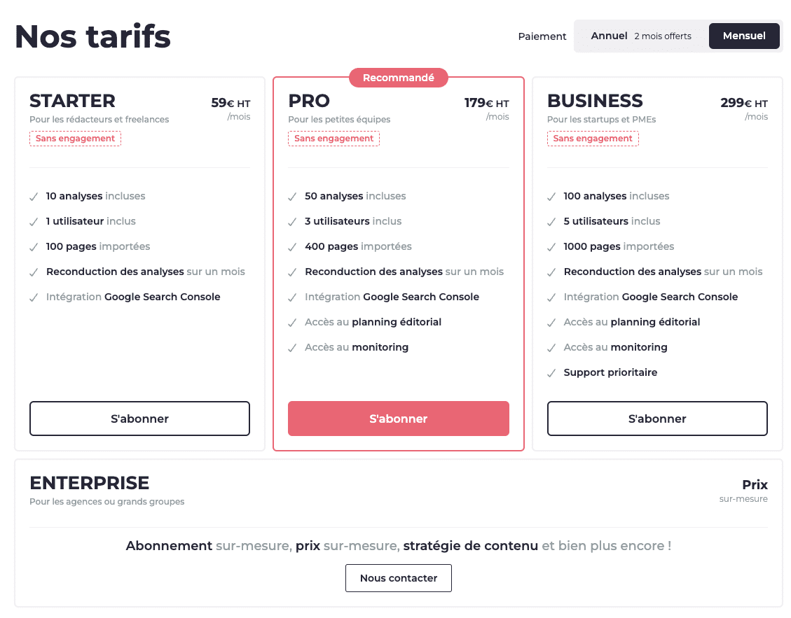 A starter plan at 59 euros for only 10 analyses, up to 299 euros for 100 monthly analyses. It is fairly expensive.